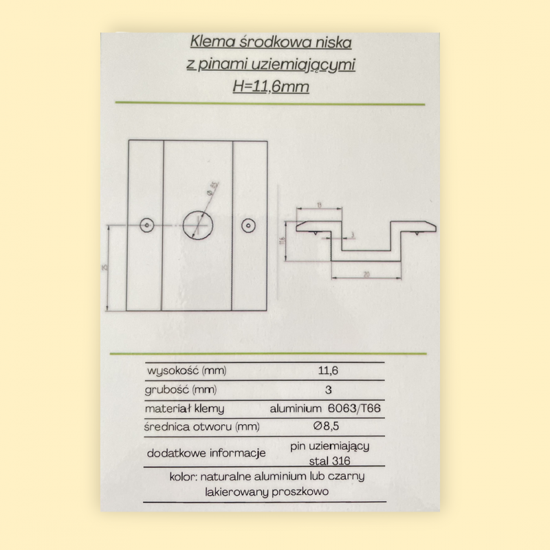 Klema dociskowa 11,6 mm z otworem M8 na śrubę M8 to innowacyjne rozwiązanie wspierające instalację ochrony odgromowej i przepięciowej, szczególnie przydatne w systemach fotowoltaicznych. Jest to kluczowy element montażowy, który służy do mocowania panelu fotowoltaicznego do aluminiowego profilu konstrukcyjnego, zapewniając stabilną instalację zarówno na dachach płaskich, jak i spadzistych. Dzięki wbudowanym pinom uziemiającym po obu stronach, klema umożliwia skuteczne wyrównanie potencjałów między modułami fotowoltaicznymi, przerywając anodowaną warstwę podczas dokręcania. Rozwiązanie to eliminuje konieczność stosowania dodatkowych podkładek uziemiających, skracając czas montażu i jednocześnie zapewniając wysoki poziom bezpieczeństwa oraz wydajności systemu. Wykonana z wysokiej jakości aluminium 6060, klema dociskowa cechuje się wyjątkową odpornością na warunki atmosferyczne. Dodatkowo, dostępna jest również wersja anodowana na czarno, co nie tylko poprawia estetykę, ale również zwiększa trwałość elementu, podnosząc jego odporność na czynniki zewnętrzne.